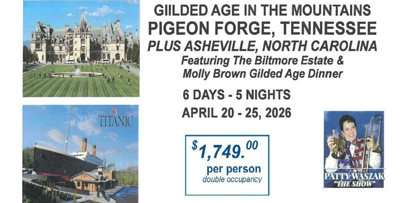 The Vanderbilts and "Unsinkable" Molly Brown! Travel across the historic Fontana Trestle bridge into the beautiful Nantahala Gorge. Tour the Biltmore Estate with an audio guide, lunch at the Sable Café, visit the gardens, and shop at Antler Hill Village. Enjoy a troubadour guided tour of the Smoky Mountains. Tour the Titanic Museum followed by The Molly Brown Gilded Age Dinner in the secret dining room of the Titanic.